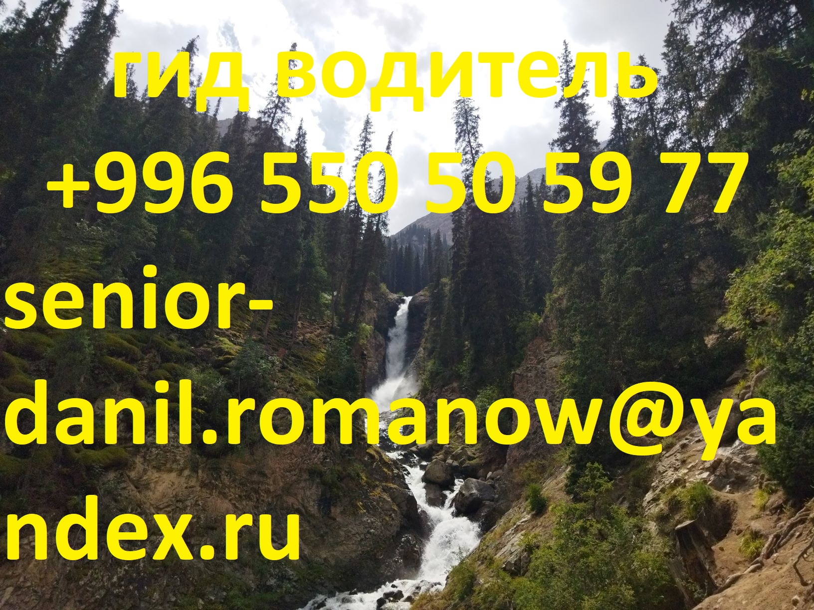 Здравствуйте, дорогие гости! Меня зовут Данил. Я родился, и вырос в Кыргызстане. Я предлагаю вам вместе со мной увидеть самые живописные уголки этой страны, высокогорные ущелья, высеченные в скалах пещеры, высокогорные озёра, красивейшие джайло. Я познакомлю вас с национальной кухней, с легендами и традициями кыргызского народа. Помимо однодневных туров я могу составить для вас индивидуальную или групповую многодневную программу, а также при желании встречу и провожу в аэропорт. Я больше чем уверен, что никто из вас не уедет из Киргизии равнодушным и вам захочется еще ни один раз сюда вернуться. Tel: +996 550 50 59 77